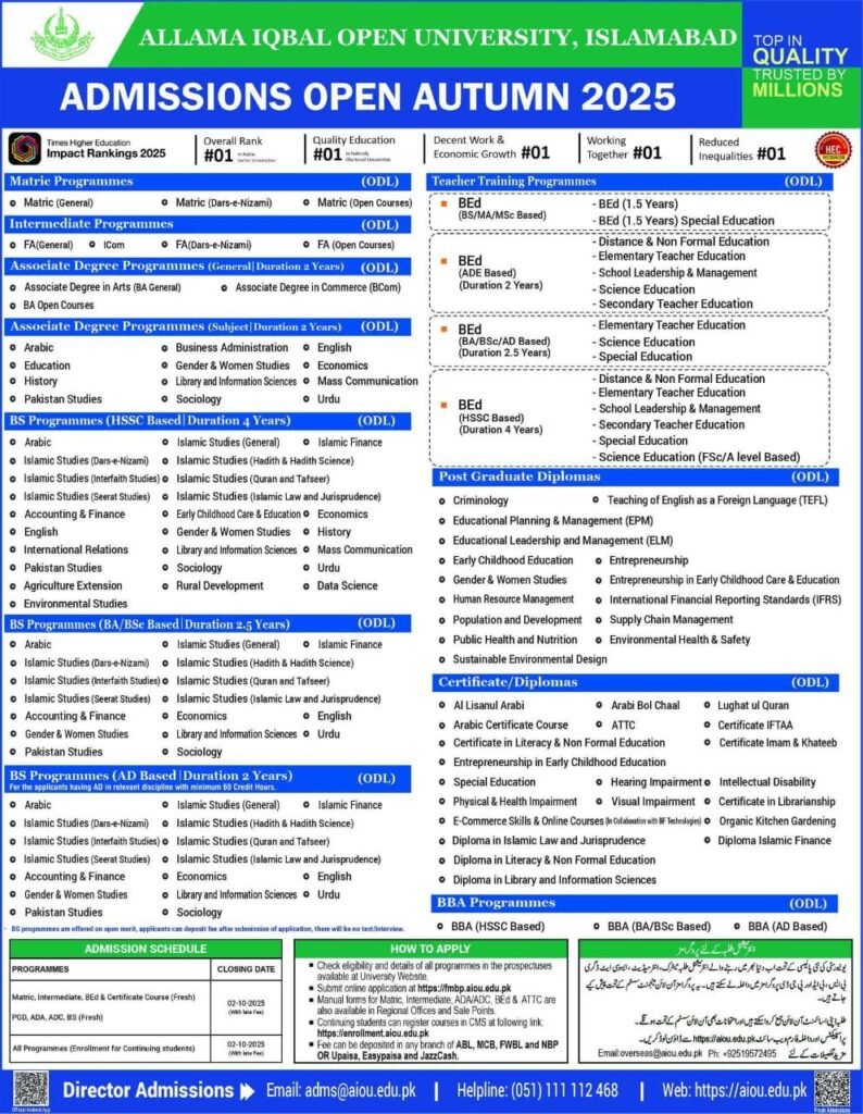علامہ اقبال اوپن یونیورسٹی – داخلہ خزاں سمسٹر 2025