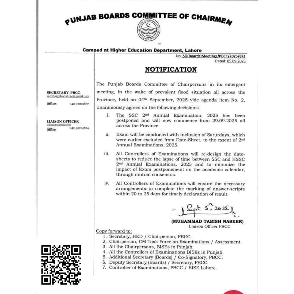 پنجاب بورڈز کمیٹی آف چیئرپرسنز کا ہنگامی اجلاس 4 ستمبر 2025 کو ہوا۔ سیلاب کی صورتحال کی وجہ سے یہ فیصلے کیے گئے ہیں: